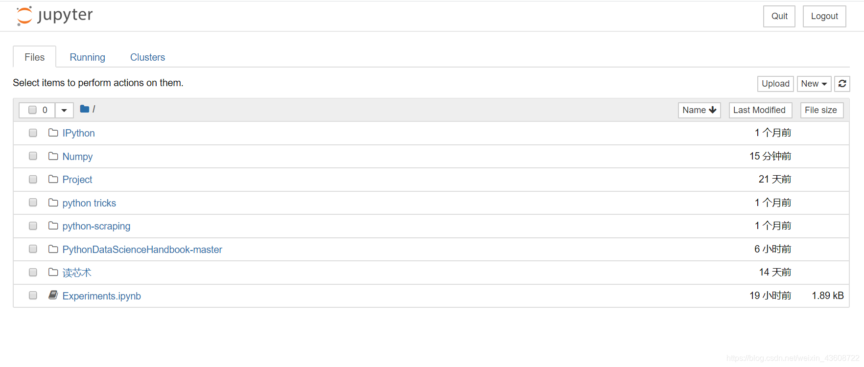 .ipynb文件,可以将.ipynb直接复制到jupyter的文件夹下面.当然你也可以点击Upload来选择你要上传的jupyter notebook的文件 - 点击